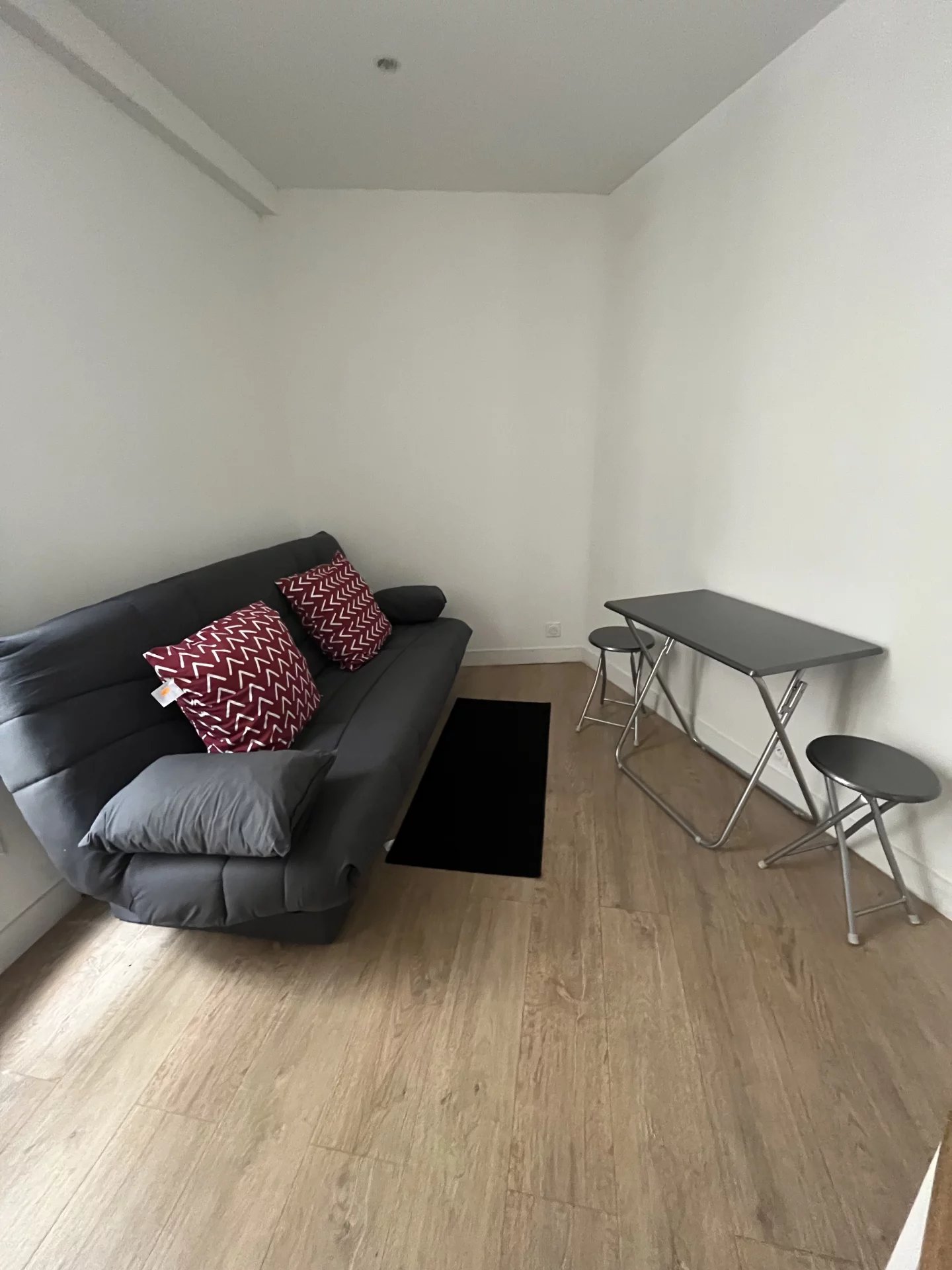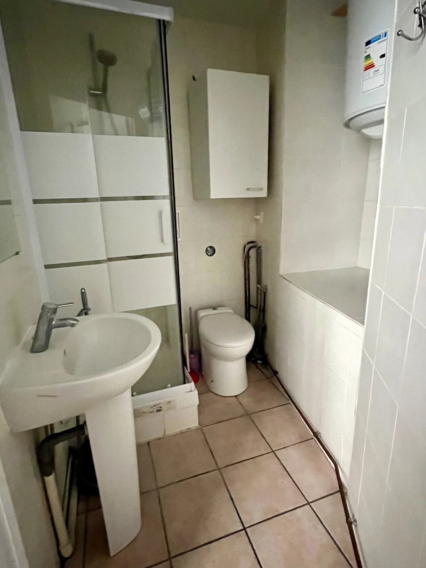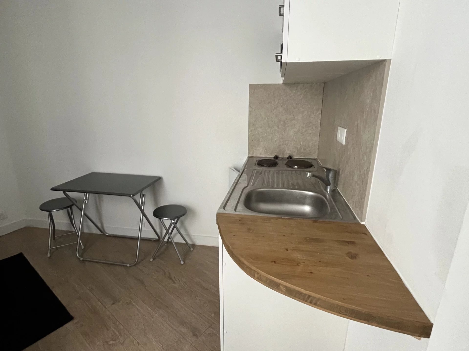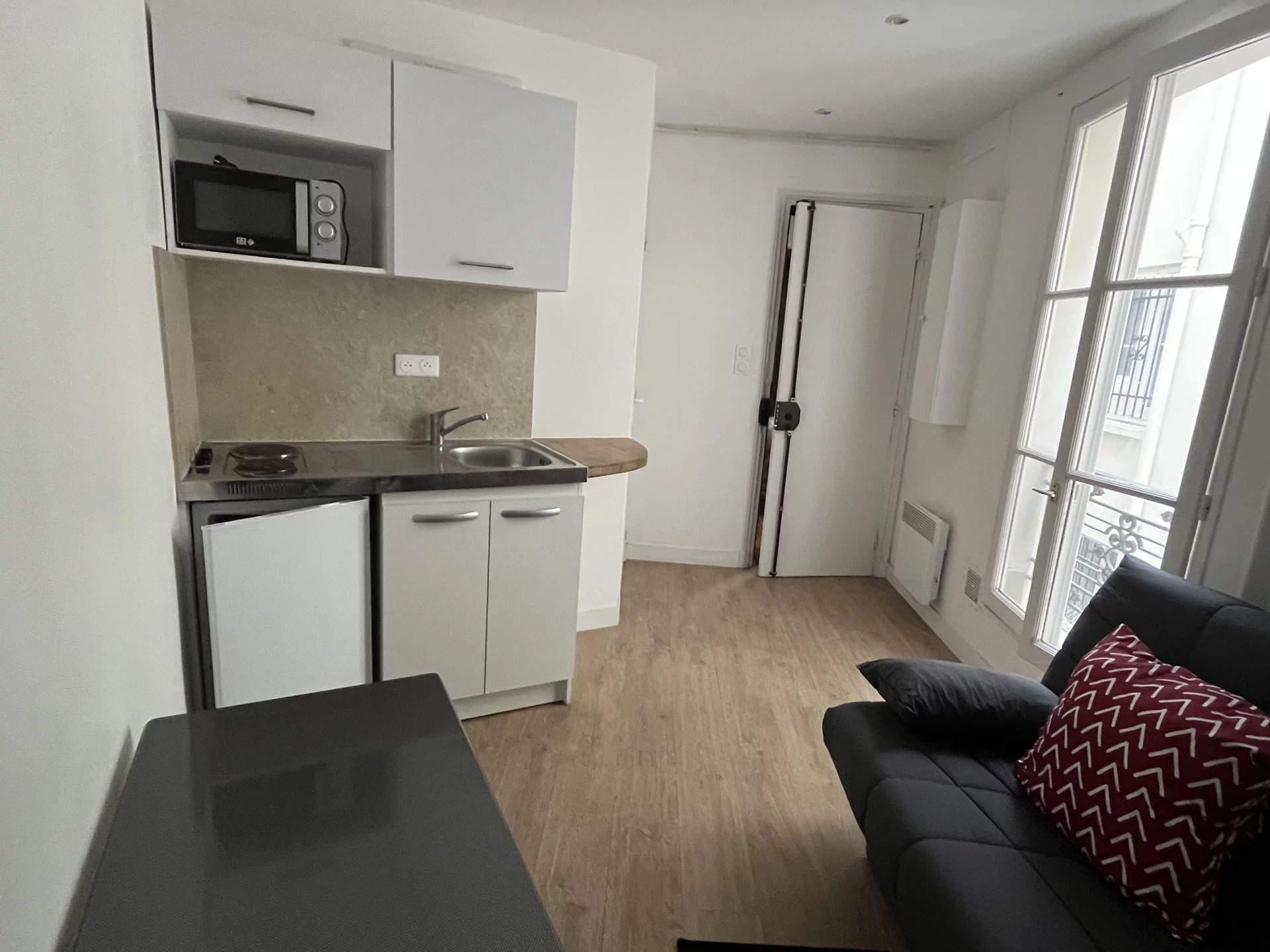 Pièce à vivre avec cuisinette ouverte (pas de lave linge possible), et salle d'eau avec toilettes.