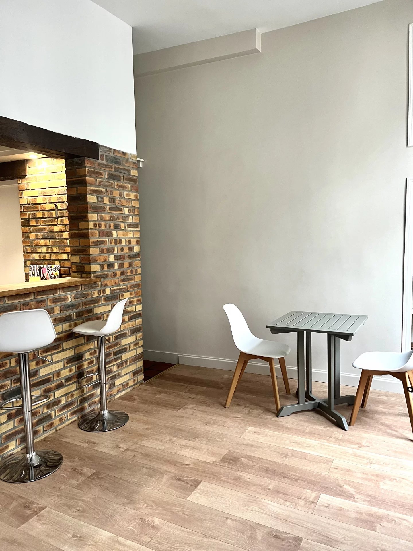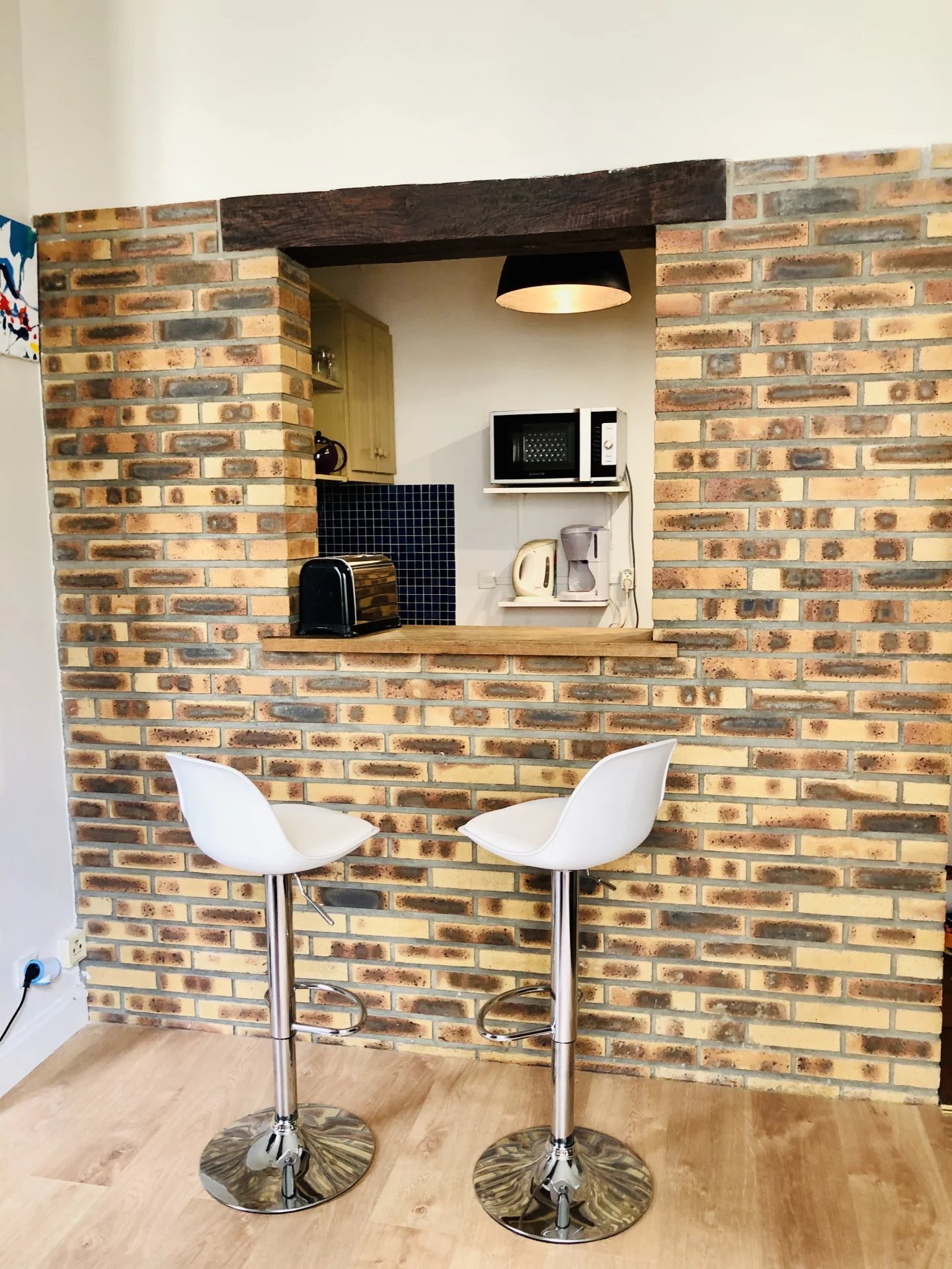 Belle pièce de vie, mezzanine de couchage, cuisine équipée semi ouverte avec bar, salle de bain avec fenêtre et toilettes séparées.