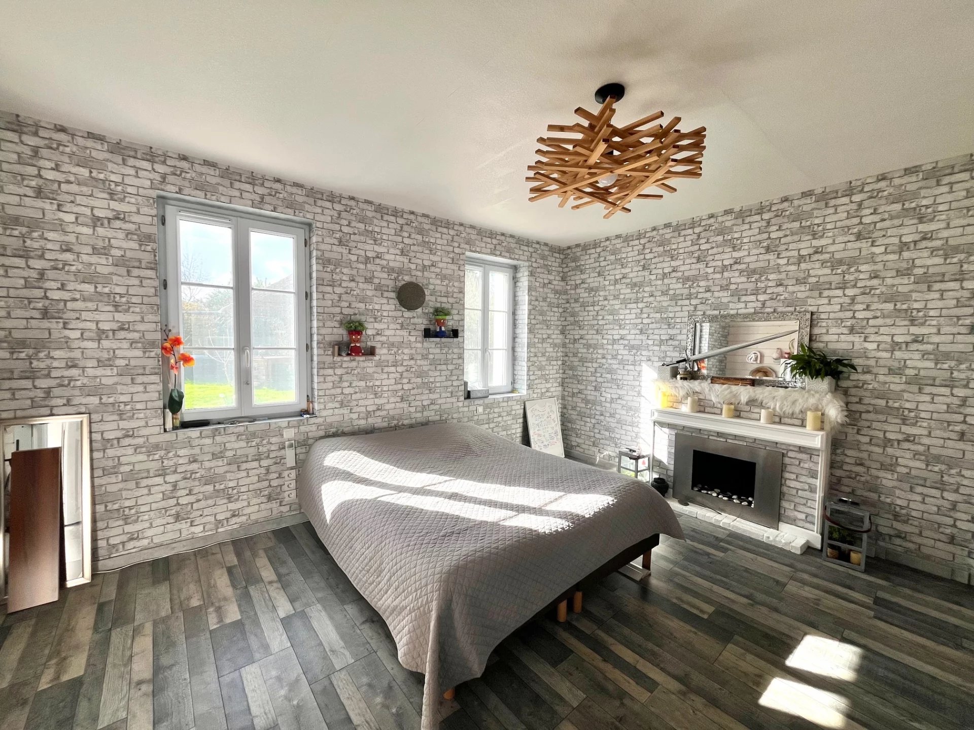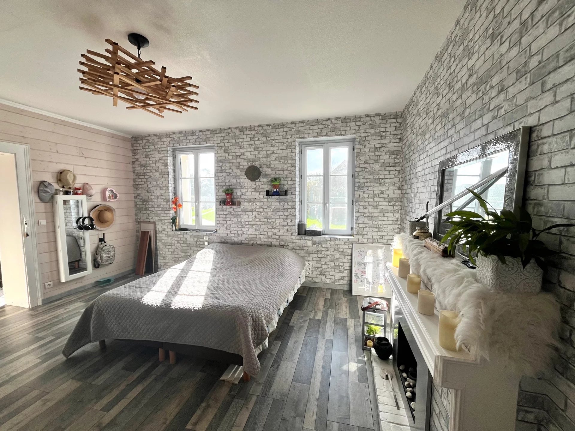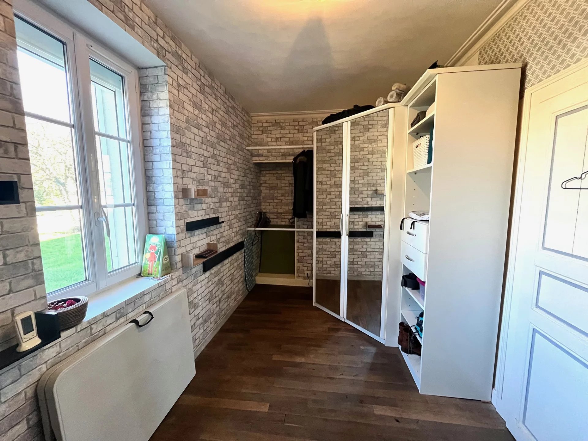 Au rez de chaussée, une entrée avec placard d'invités, un salon télé traversant, une vaste salle à manger/cuisine avec espace bureau éclairés par un bow window donnant sur le jardin, une chambre parentale agrémentée d'une cheminée à l'éthanol et d'un vaste dressing avec fenêtre (dans lequel une salle d'eau pourrait tout à fait être installée), et des toilettes d'invités.
