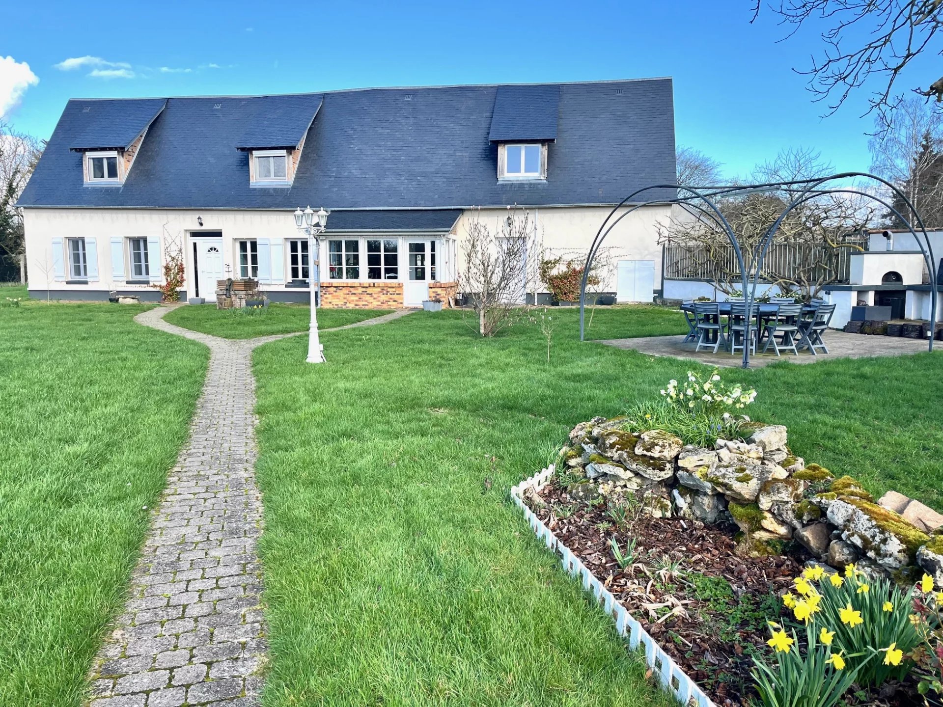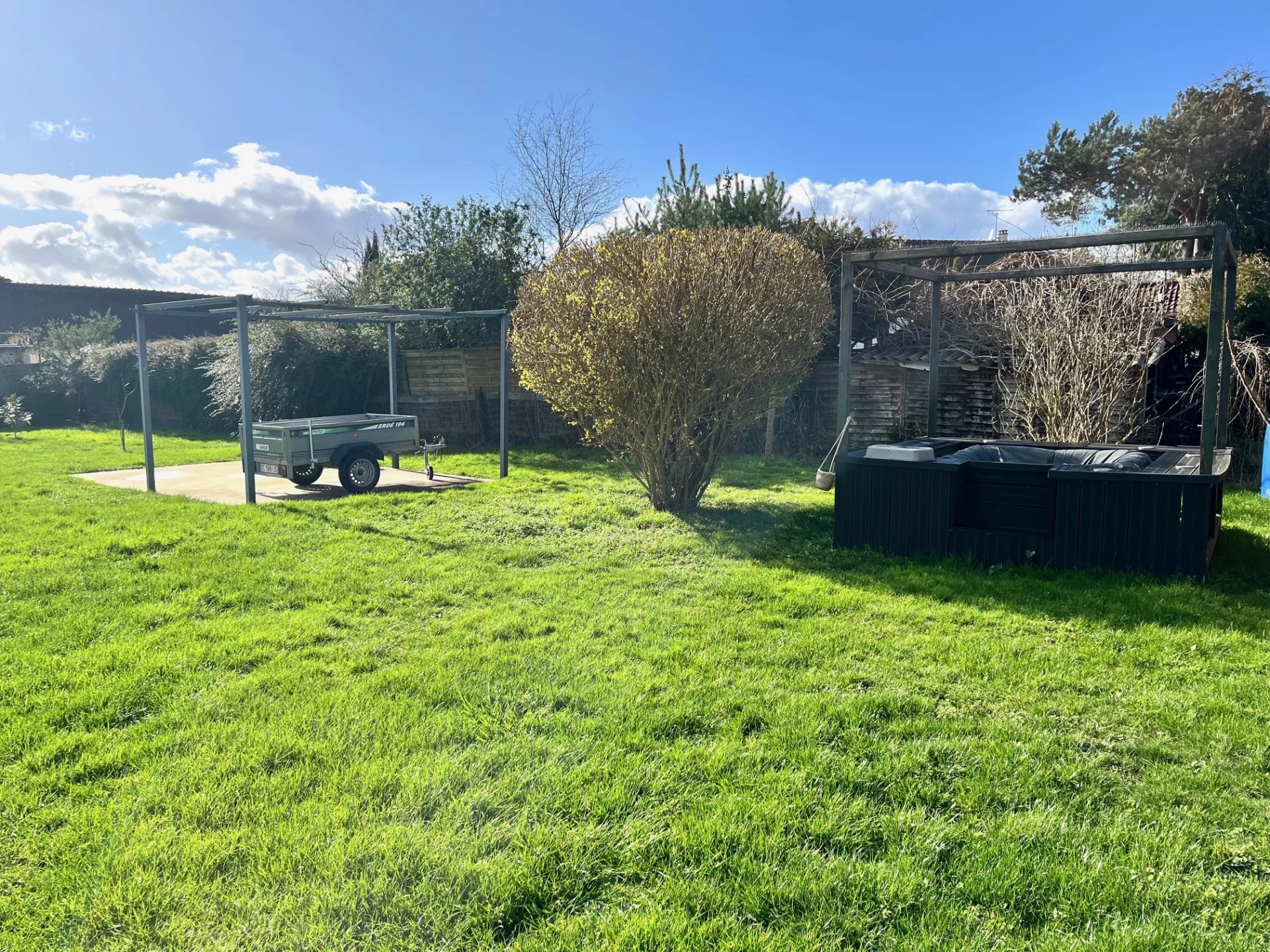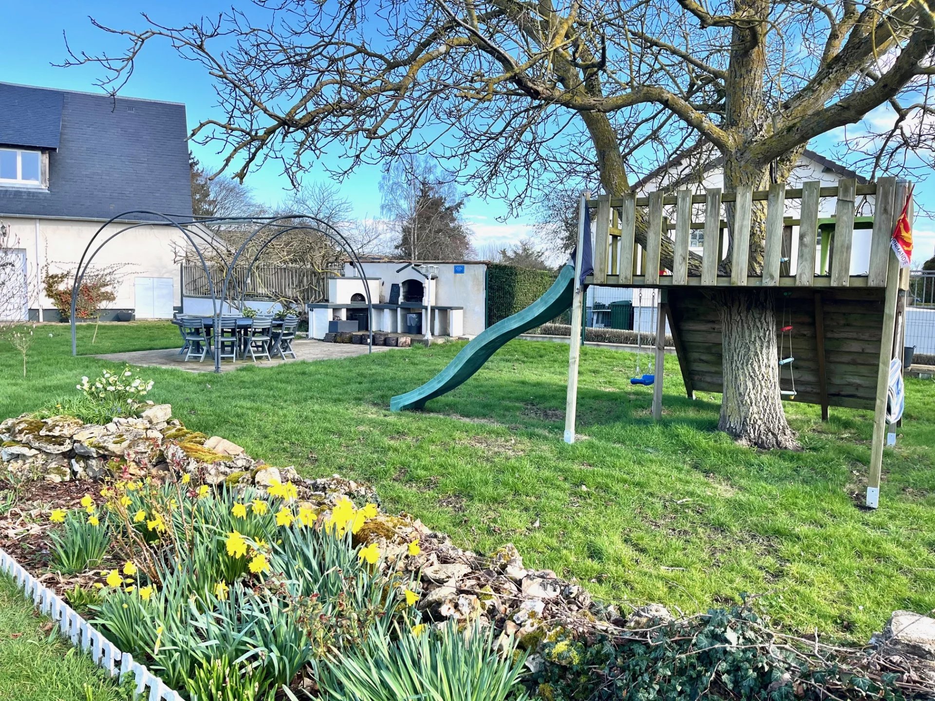 Le jardin de 2000m² entièrement clos a été aménagé de façon très agréable: d'un côté un espace jeux (terrain de pétanque et cabane pour les enfants construite dans un épais noyer) et repas (avec tonnelle pour se protéger du soleil d'été, barbecue et four à pizza) et de l'autre un joli bassin avec petite terrasse solarium.