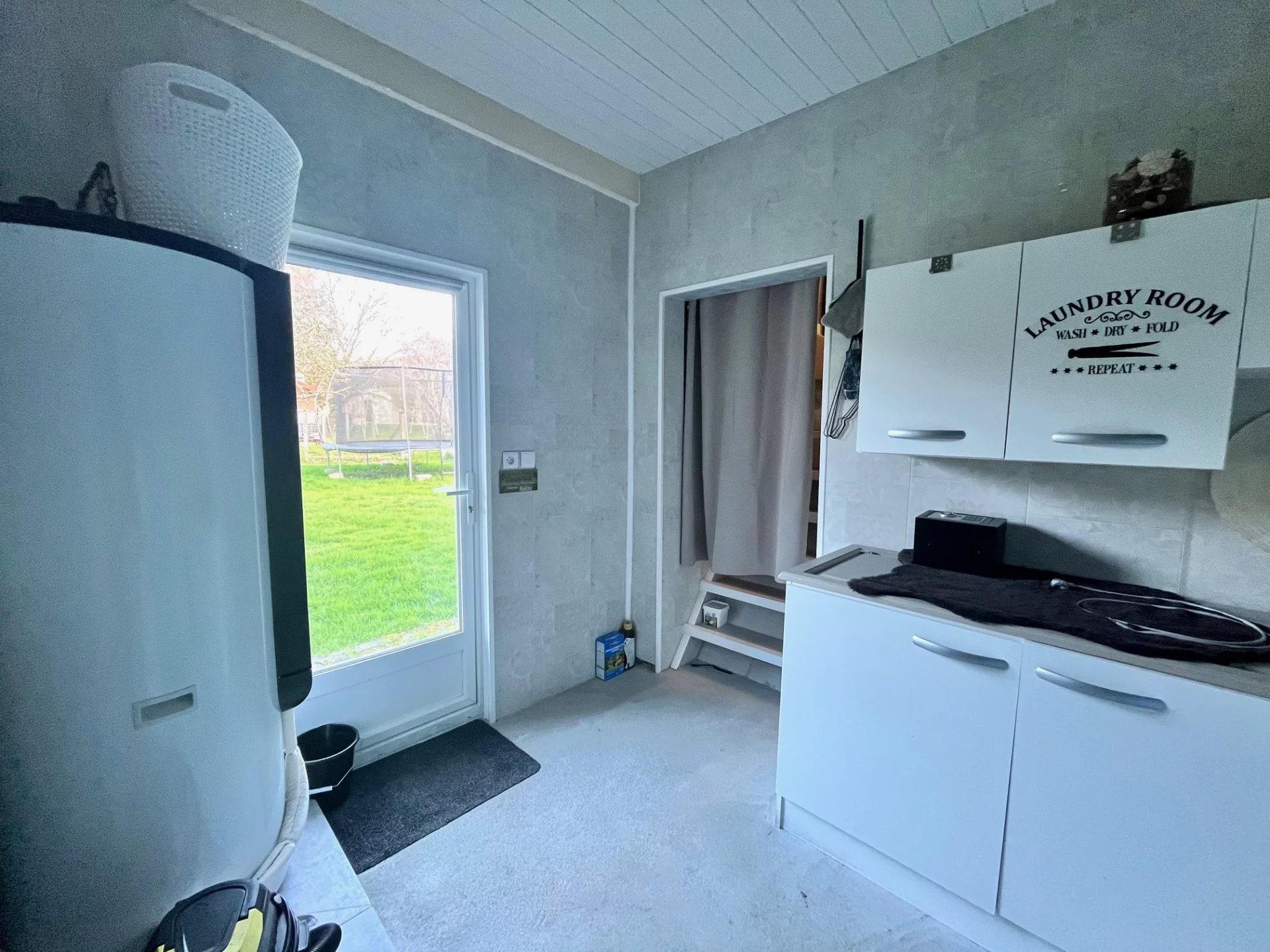 Une buanderie jouxte la salle de bain avec accès direct à l'arrière du jardin où se trouvent la mare avec solarium, les potagers suspendus et le poulailler.